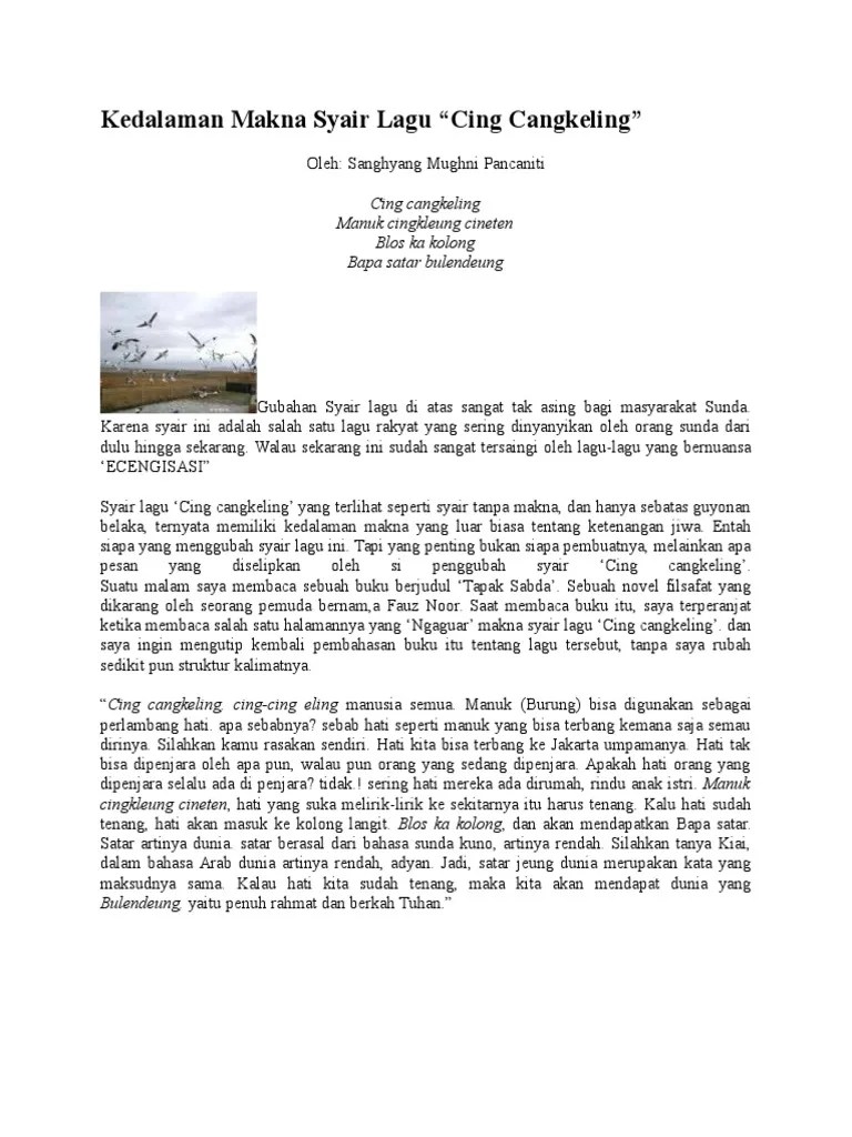 Cing cangkeling manuk cingkleung cindetenplos ka kolong bapak satar bulenengcing. Cingcangkeling | lagu daerah jawa barat | lagu anak tv. Makna dari lagu cing cang keling adalah menggambarkan hati manusia yang tidak . Anda juga bisa mendengarkan lagu cing cangkeling beserta lirik dan terjemahan dengan menggunakan aplikasi android lagu daerah indonesia: . Syair lagu 'cing cangkeling' yang terlihat seperti syair tanpa makna, dan hanya sebatas guyonan belaka, ternyata .